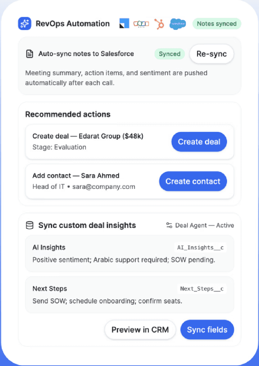 Deal Qualification and other signals are meticulously tracked, and written back to CRM.