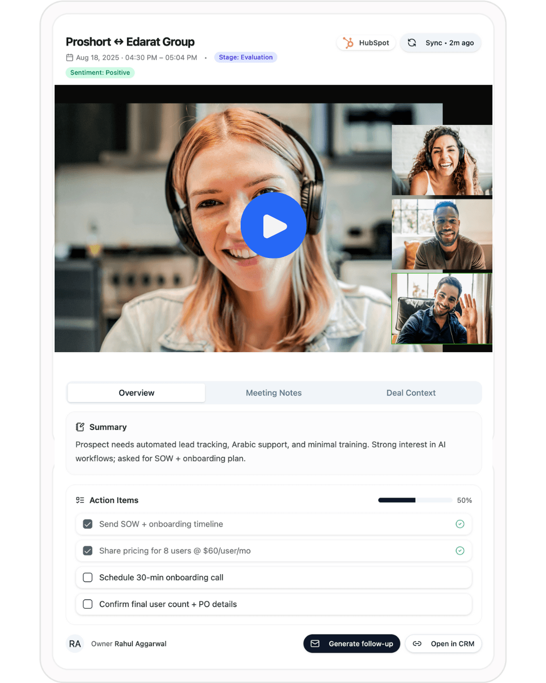Meeting briefs before calls. Smart prompts during. Auto-summaries and CRM updates after. No admin, no gaps.